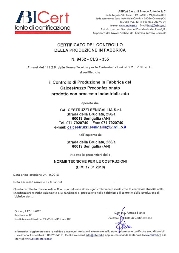 La Calcestruzzi Senigallia è un’azienda certificata e attenta alla qualità in ogni fase del processo produttivo. Siamo qualificati con il certificato FPC (Factory Production Control), che attesta il controllo costante e la conformità del nostro sistema di produzione del calcestruzzo direttamente in fabbrica. Questo certificato garantisce che ogni lotto venga realizzato seguendo procedure rigorose, con tracciabilità e verifiche puntuali, a tutela della sicurezza e dell’affidabilità del prodotto finito.